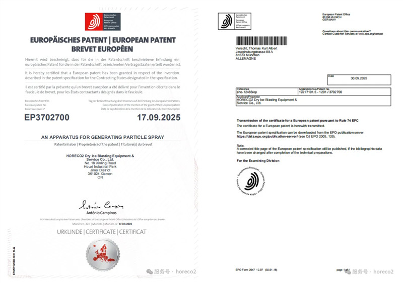 近日,厦门和丰利干冰除污设备有限公司(HORECO2 Dry Ice Blasting Equipment & Service Co., Ltd.)传来重磅喜讯 —— 其研发的AN APPARATUS FOR GENERATING PARTICLE SPRAY 技术成功获得欧洲专利授权,标志着中国智造在该技术领域获得了欧洲市场的权威认可,正式迈向全球竞争的核心舞台。